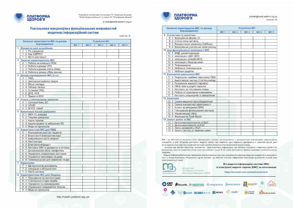 - аналіз ринку МІС, які працюють в Україні, створення чек-листа функціональних можливостей МІС згідно мінімальних вимог та оцінка їх відповідності визначеним вимогам.